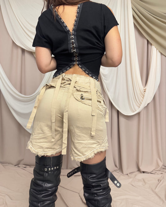 BEIGE UTILITARIAN MINI SHORTS WITH DISTRESSED HEMS by Marithé + François Girbaud