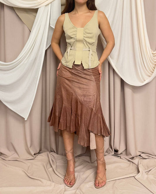 SOFT RIBBED V-NECK VEST WITH DISTRESSED SILK TRIM