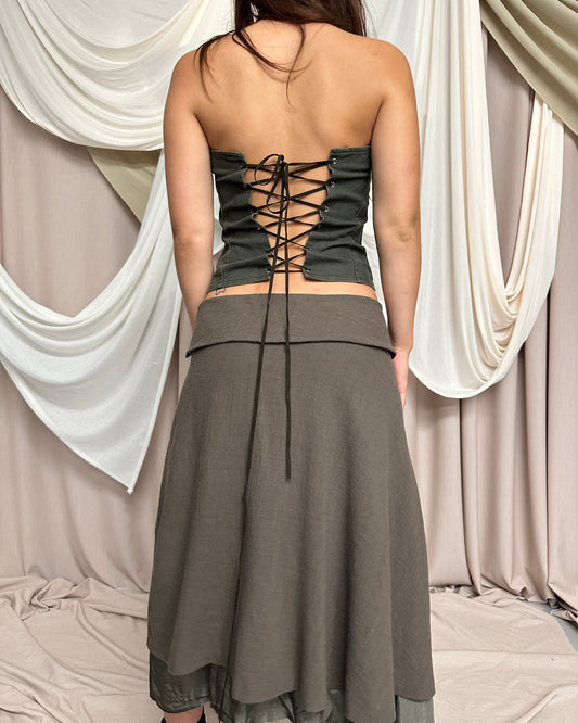 KHAKI STRUCTURED LACE UP CORSET WITH BROWN SUEDE TIES