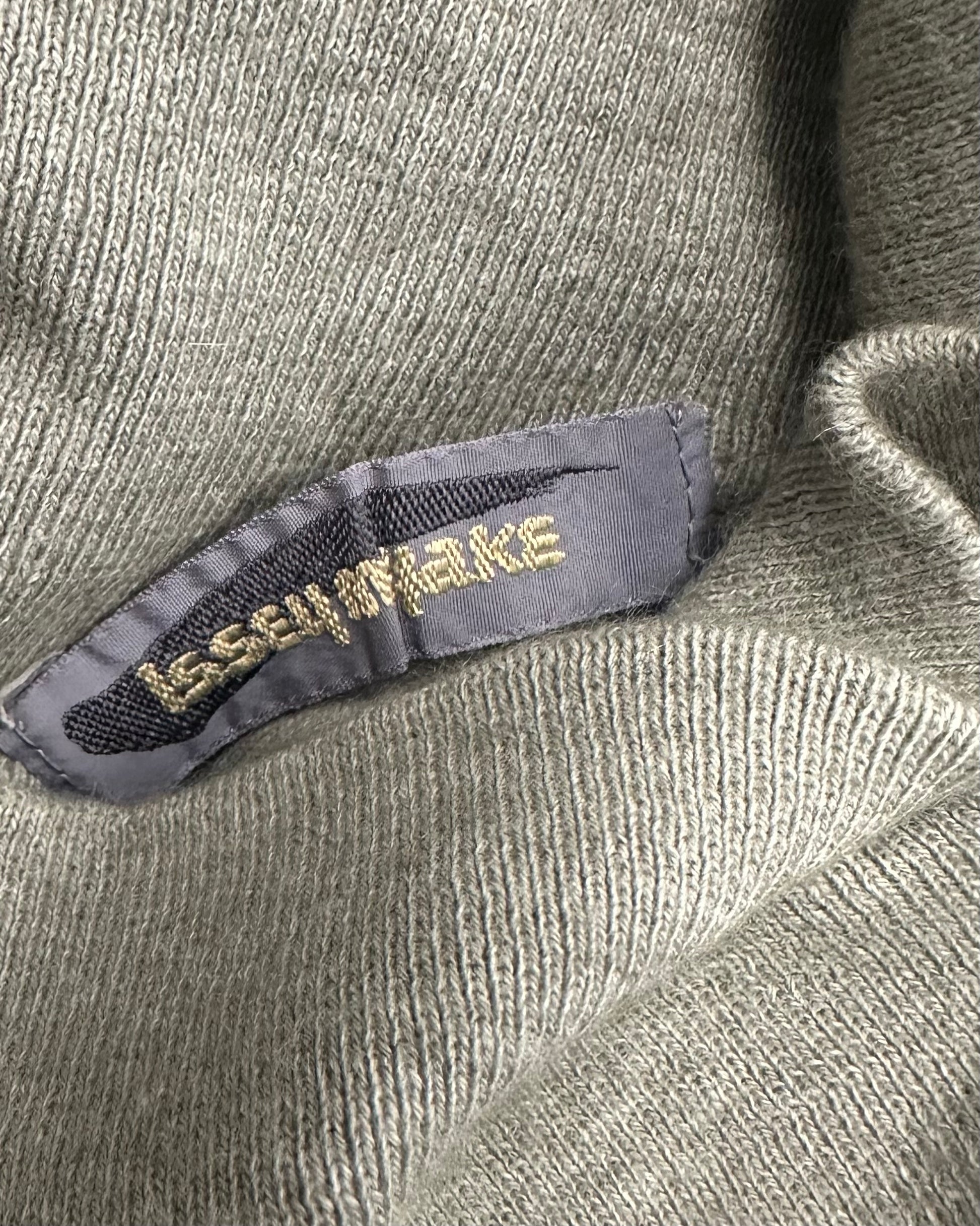 Very soft wool and cotton blend faded sage green jumper / sweatshirt with a unique slouchy silhouette. Features batwing sleeves, a long bodice and a high neckline with a V-shaped seam. 80s tag Issey Miyake.
