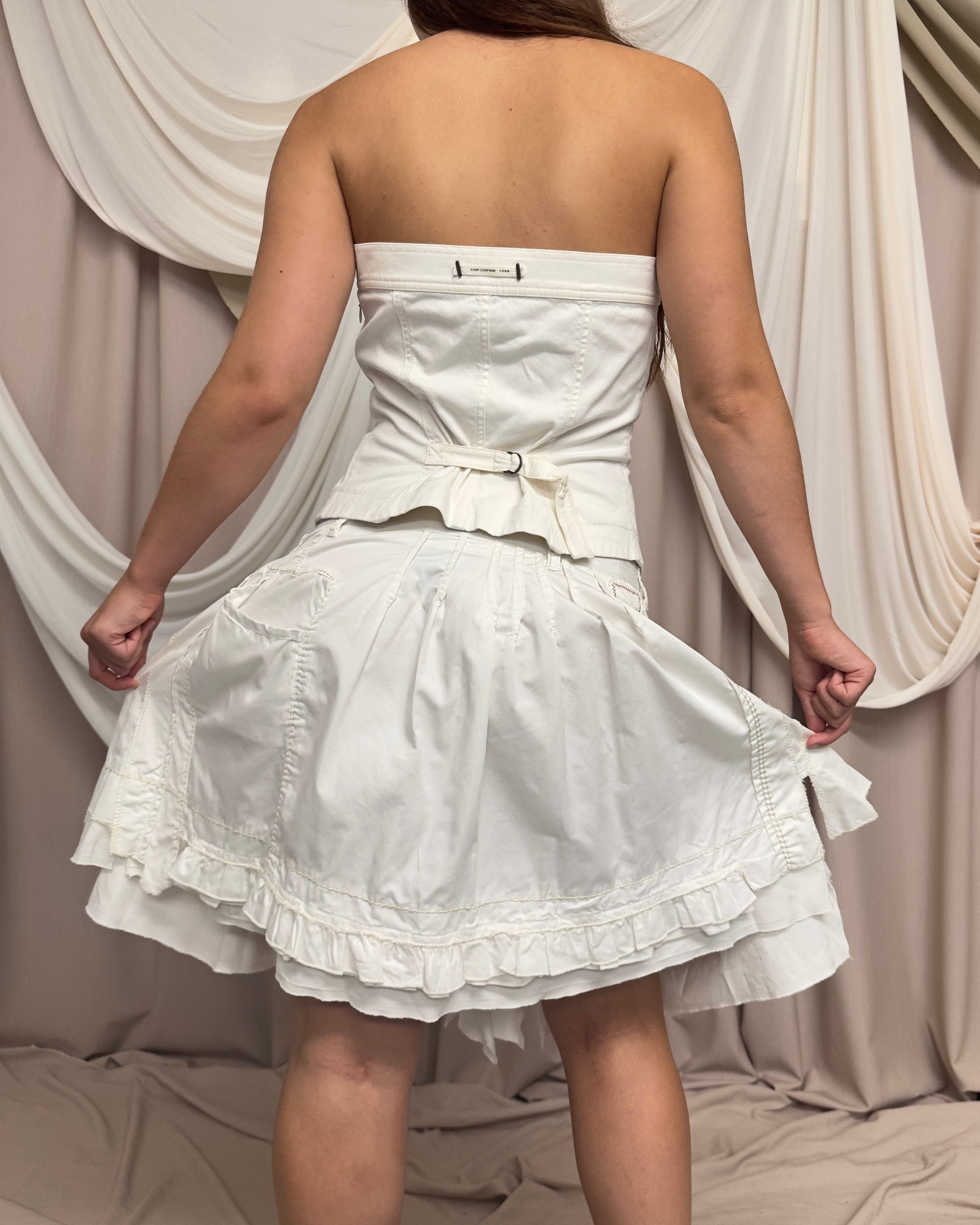 M+FG white midi skirt in 100% cotton composition. Exposed stitching and multiple hanging strap details give a deconstructed feel. Archive FW 2005.