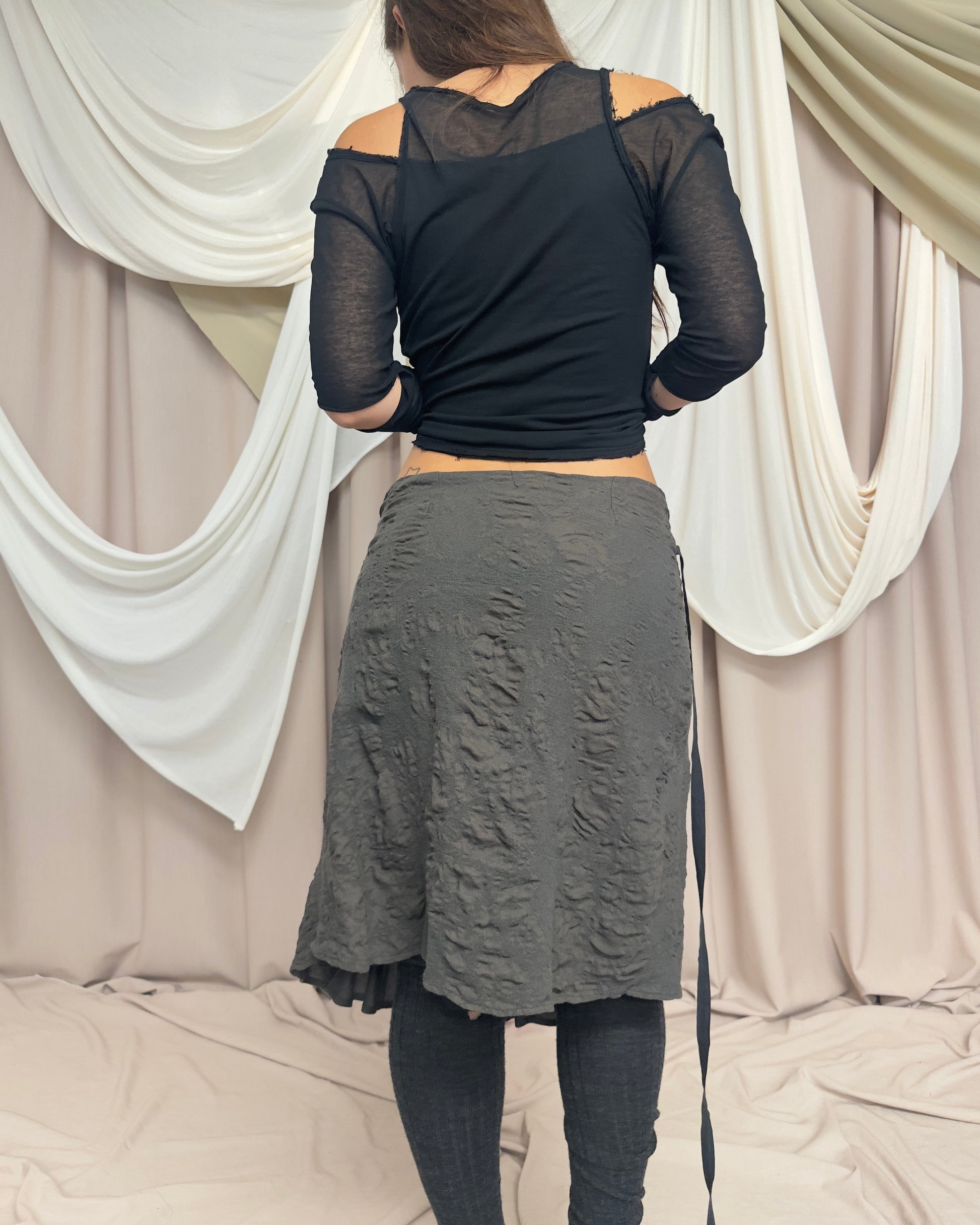 Off-shoulder long sleeve top with layered vest in semi sheer mesh. 100% cotton. Deconstructed feel with distressed hems. Cutouts at the elbow.