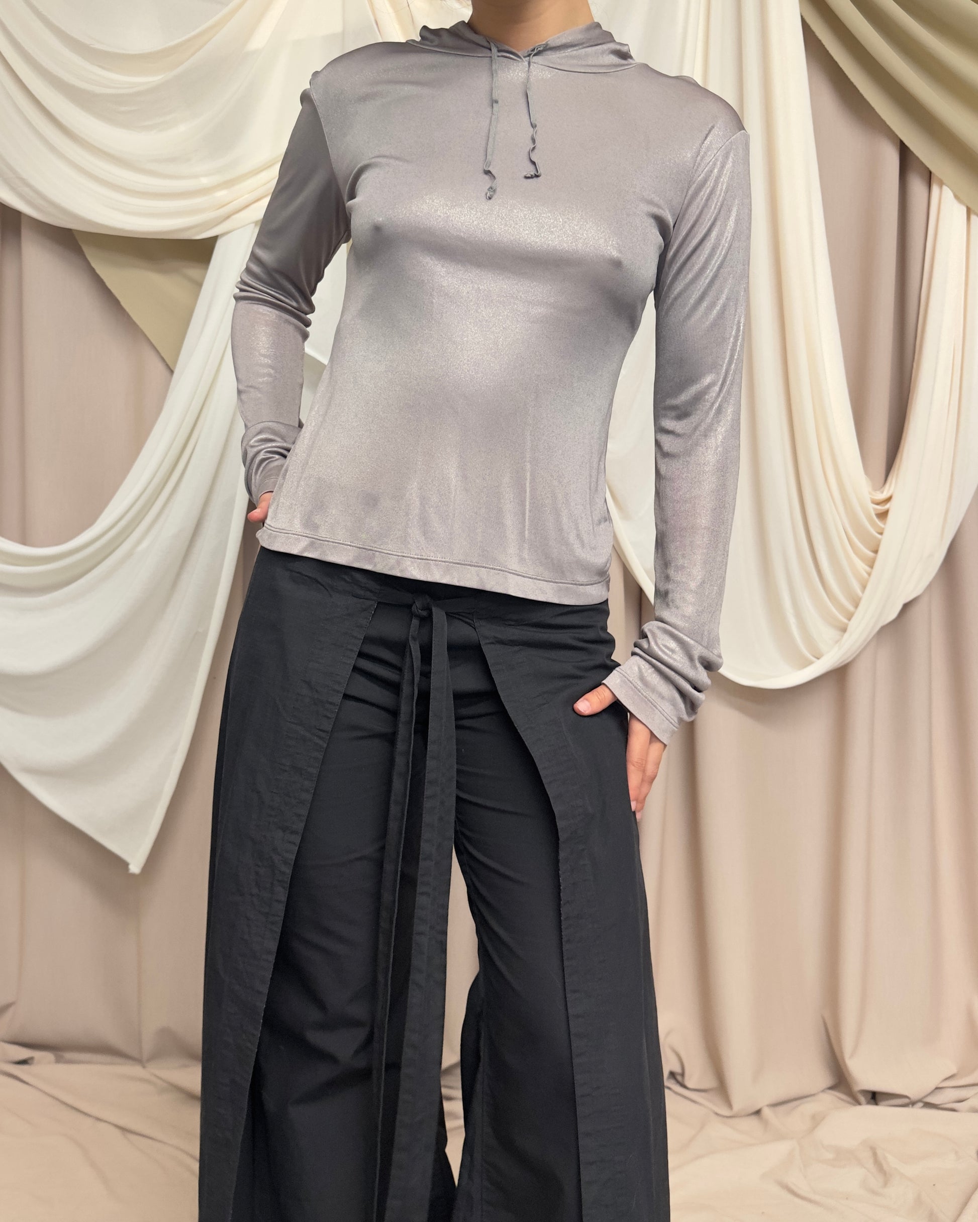 Pale purple slightly sheer long sleeve with a metallic sheen in a flattering lightweight slinky fabric. Slim fit hood with adjustable drawstring.