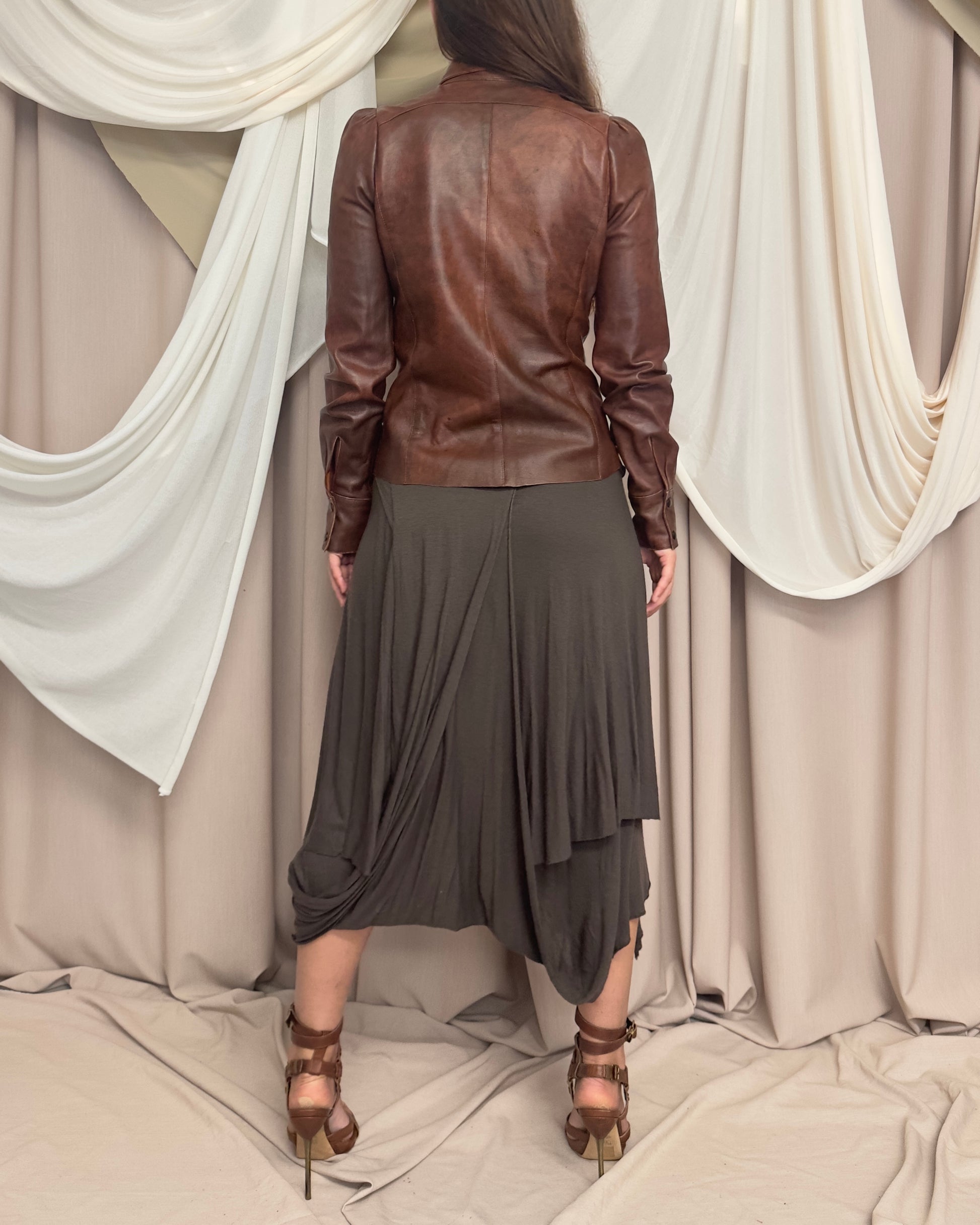 Rust / dark reddish-brown washed real leather shirt / light jacket with metal popper closures. Exaggerated pointed collar. Beautifully constructed form fitting silhouette.