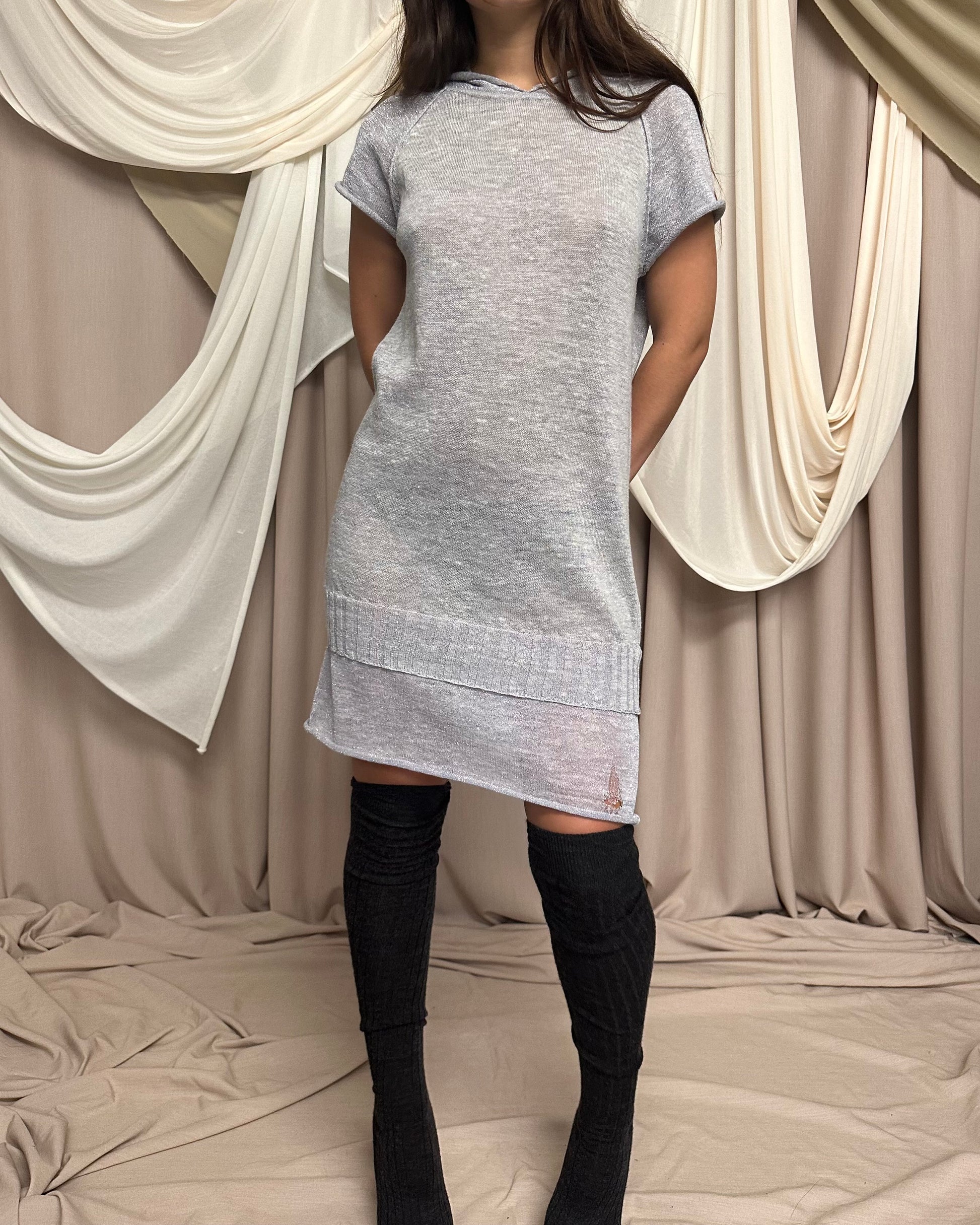 Light grey knit mini dress / tunic with cap sleeves and a hooded neckline. Semi sheer, with a ribbed detail creating a slightly flared, fishtail hem. Slightly metallic finish.