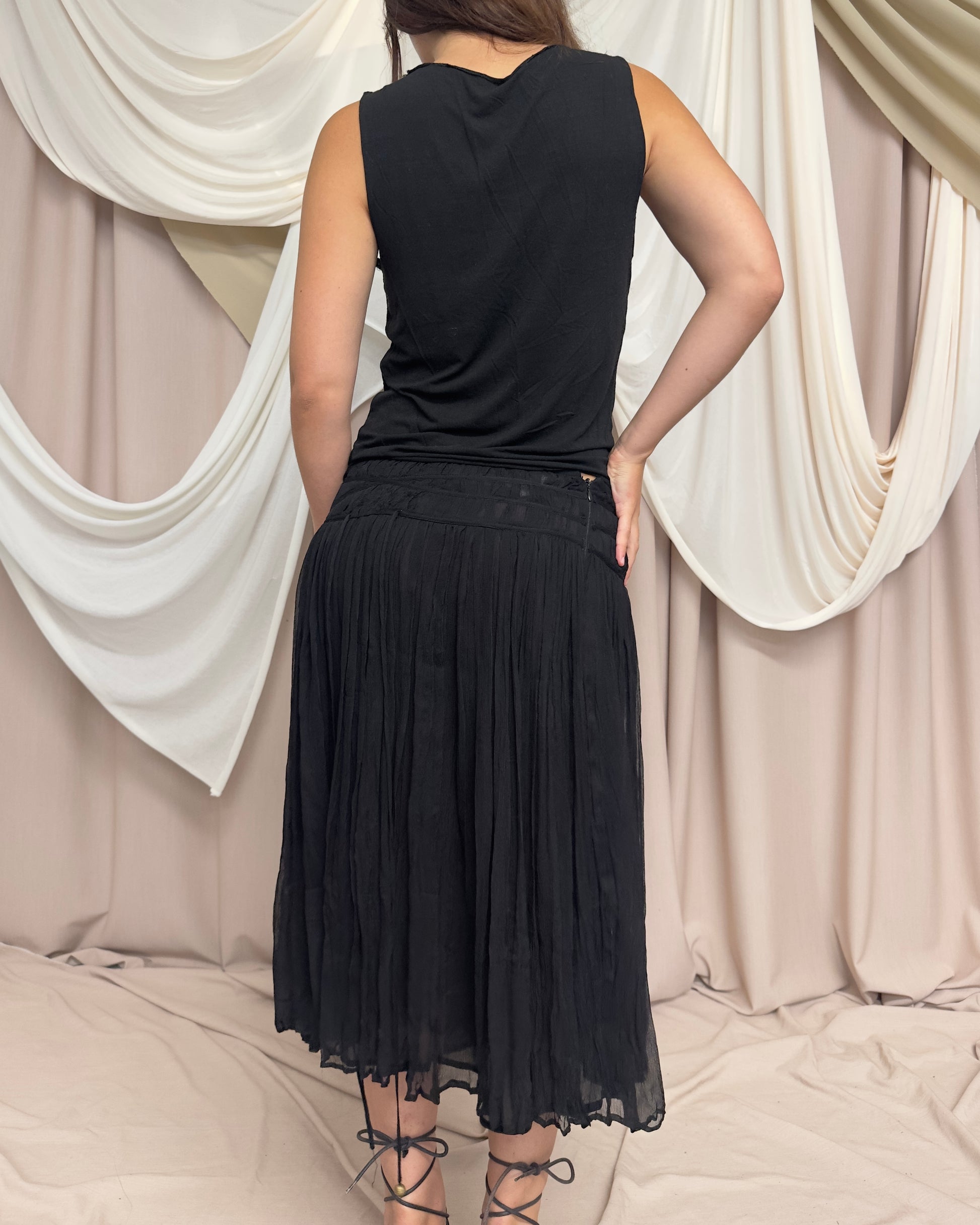Delicate silk midi skirt with micro pleats and front tie detail. Semi sheer. Zip side closure. Class by Roberto Cavalli line.