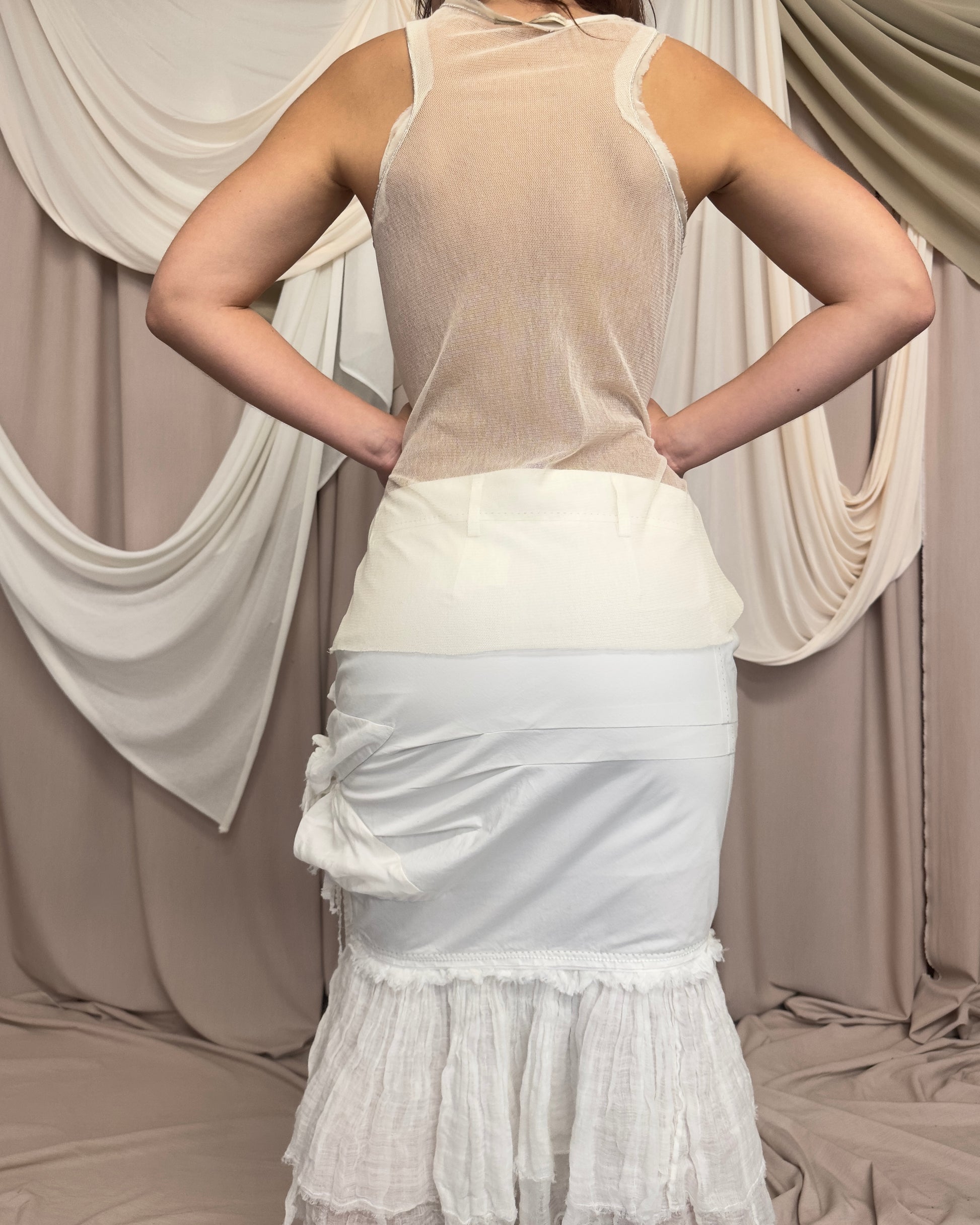 Lightweight raw cut cream mesh vest with intricate floral appliqué and distressed silk trim by M+FG. Archive SS 2007.