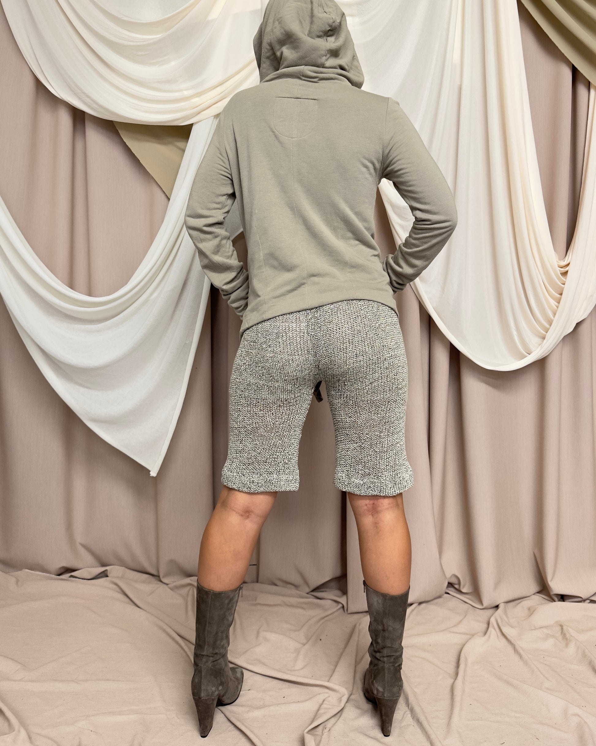 Wool blend jacket in sandy beige / greige with slouchy fit, oversized hood and pointed asymmetrical hems. Adjustable drawstrings at the sides and front create ruched effect. Unique metal ball clasp closure.