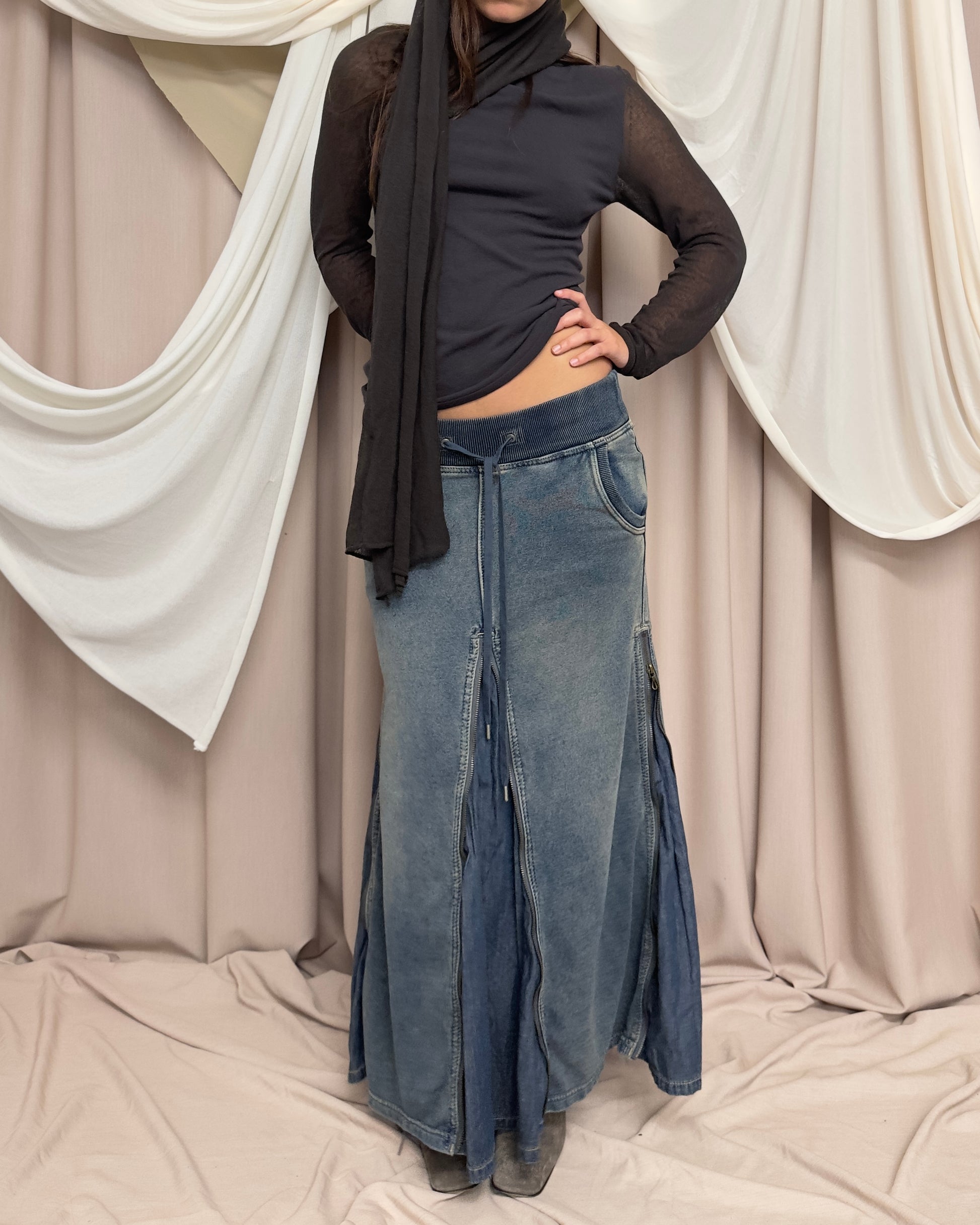 Soft stretch bodice with lightweight semi sheer long sleeves. Extended sheer panel can be wrapped / tied in multiple ways.