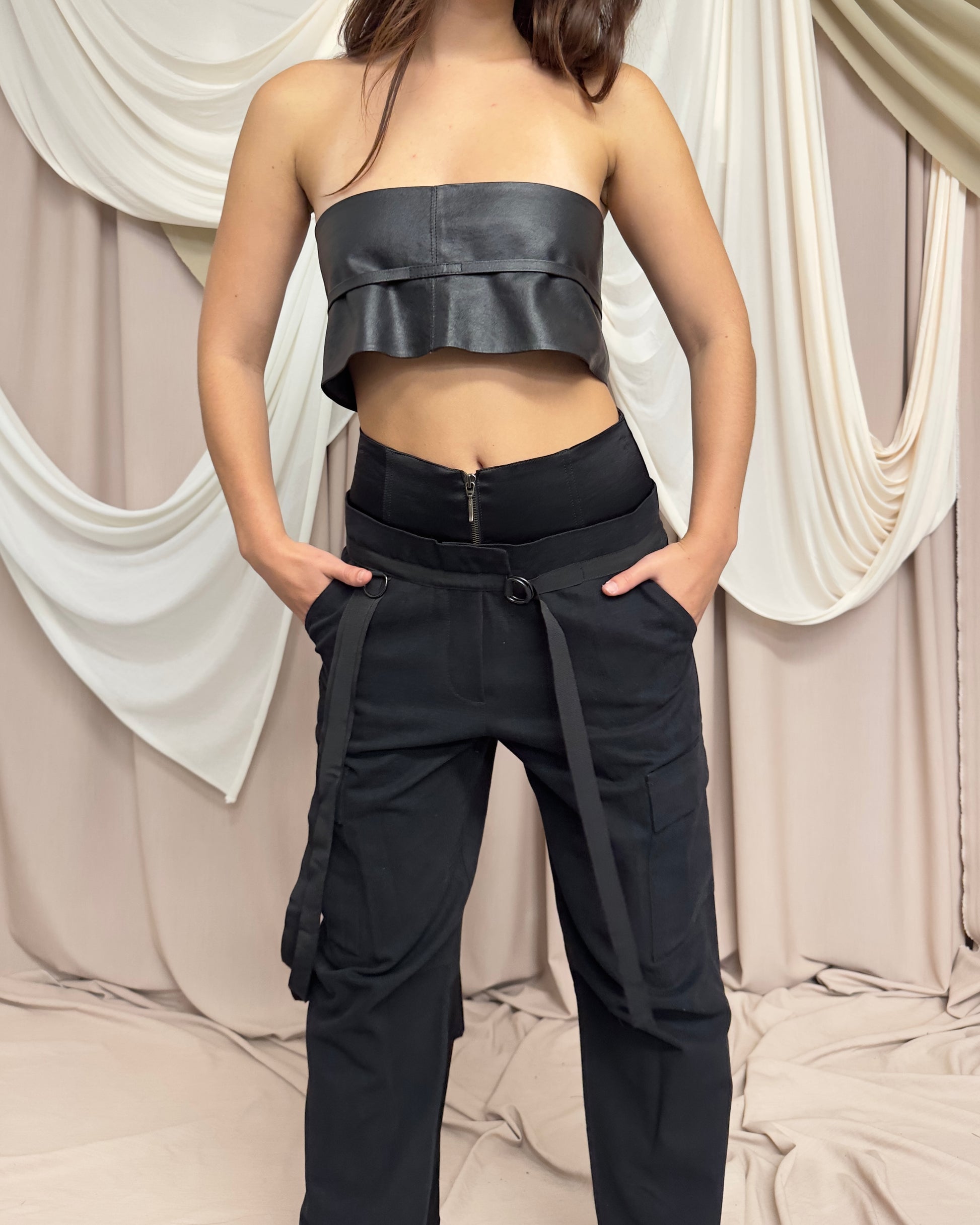Black sturdy wool and cotton blend cargo trouser with unique layered satin waistband and zip closure. Multiple adjustable strap details with metal D-rings. Adjustable hems.