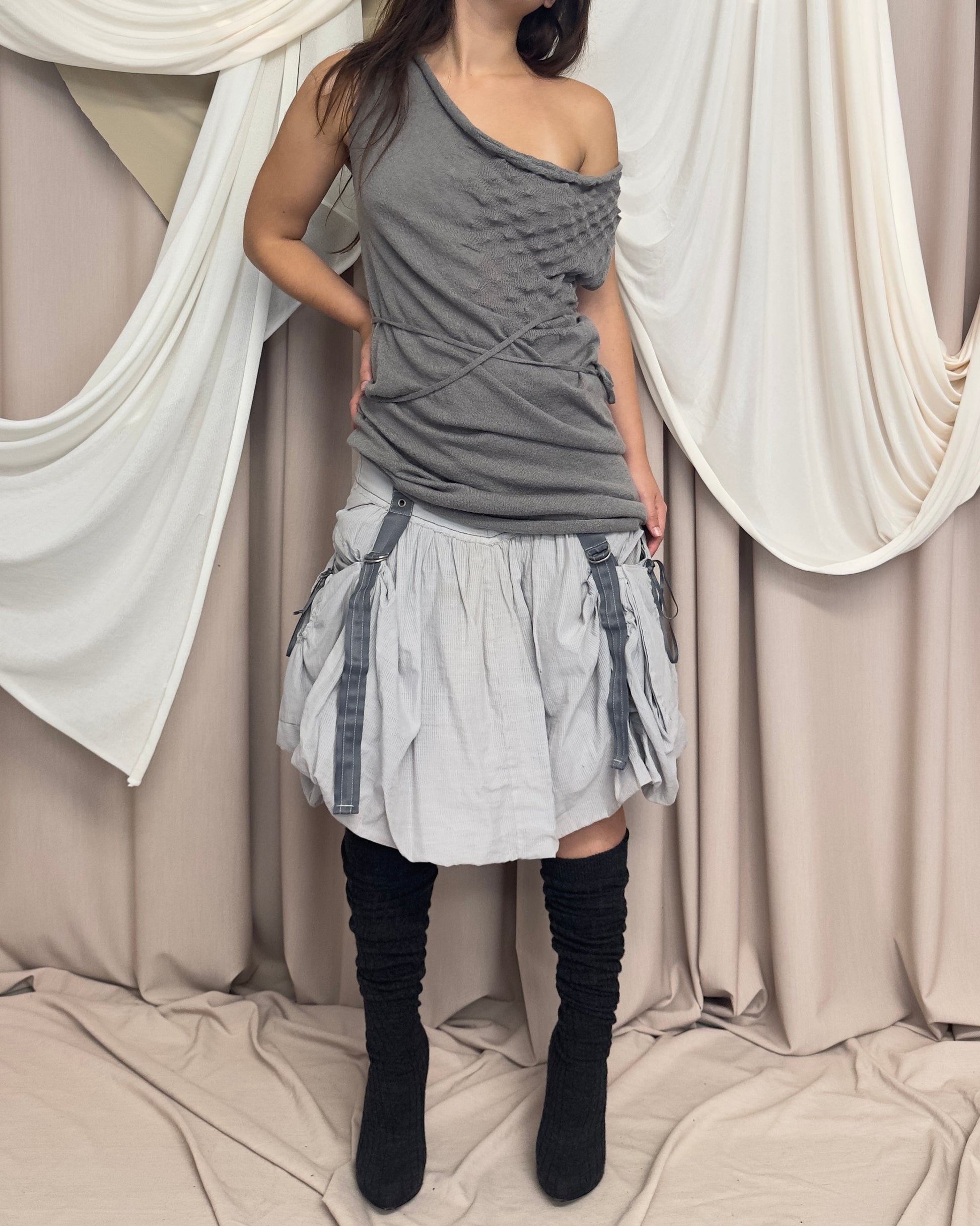 Alpaca wool blend tunic / mini dress in a light grey, with textured panel. Ties at the back can be wrapped to adjust slouchy silhouette.
