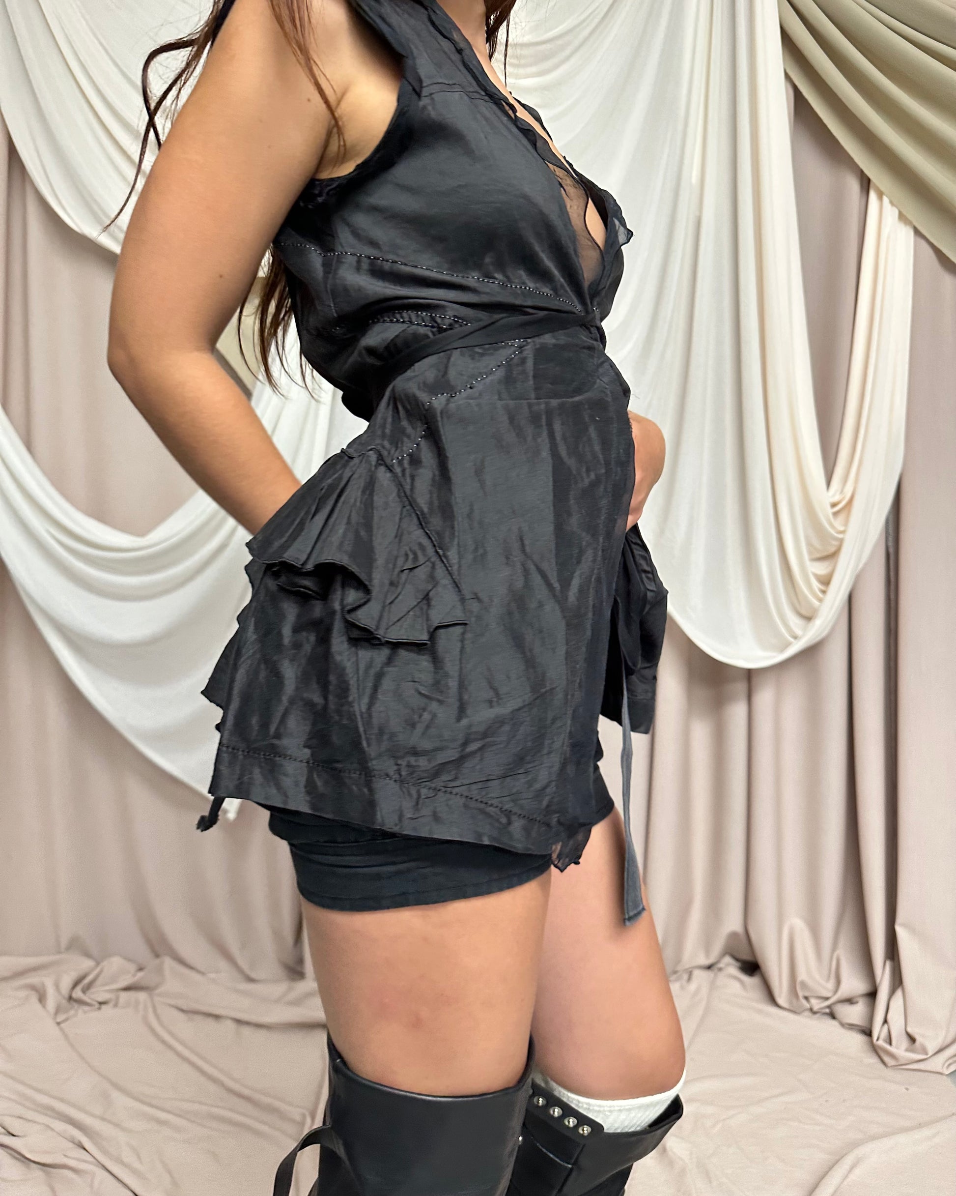 Black linen waistcoat / blouse with a long, tie front closure - can be wrapped around the waist to create silhouette. Features multiple ruffled panels, a 100% silk ruffled trim along the hems and delicate silk sleeves.